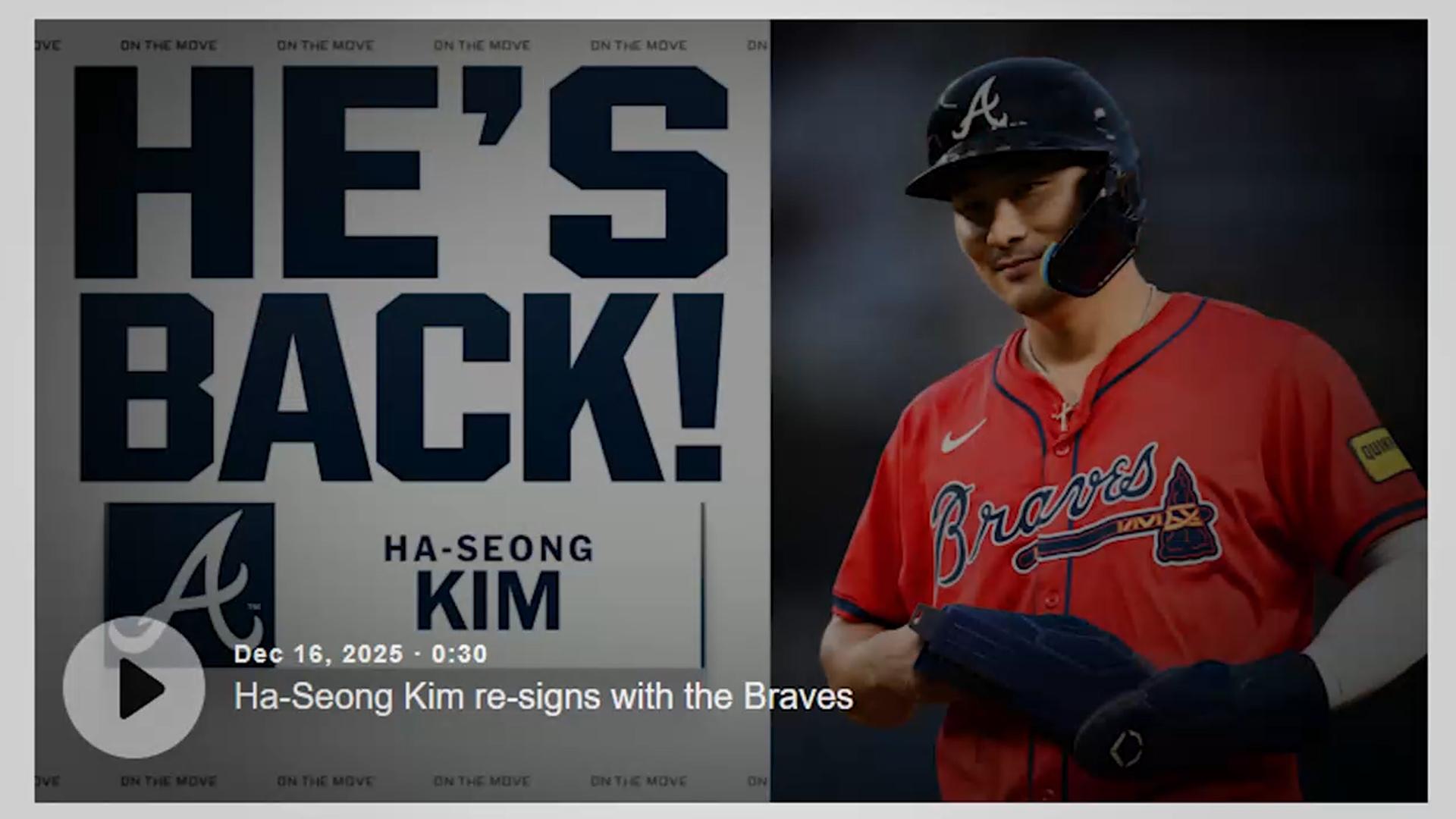 김하성, 애틀랜타와 짧고 굵은 계약…'FA 삼수 예약'[앵커]미국 메이저리그 애틀랜타 브레이브스의 김하성 선수가 원소속팀 애틀랜타와 계약했습니다.1년 단년 계약을 체결한 김하성 선수는 이로써 사실상 'FA 삼수'에 도전하게 됐습니다.우준성 기자의 보도입니다.[기자]FA 시장에 나왔던